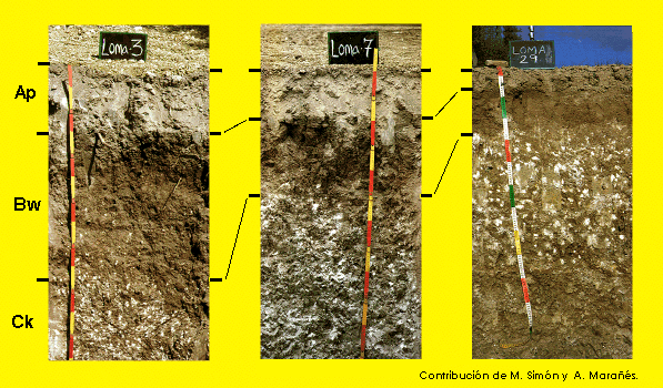 Estos tres suelos pertenecen a la misma región y se han formado bajo la misma combinación de factores formadores (margas, en relieves llanos, clima mediterráneo, ...). Su perfil guarda bastantes analogías, sin embargo destaca la distinta profundidad a la que aparece el horizonte cálcico. ¿Por qué?