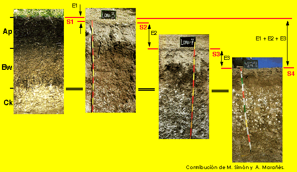Puesto que los tres suelos mostrados en la pantalla anterior se han formado bajo la acción de los mismos factores formadores, sus morfologías han de ser muy similares. Concretamente el horizonte cálcico se ha tenido que formar siempre a la misma profundidad (soportan las mismas precipitaciones, igual temperatura, igual permeabilidad...). Si hoy día no lo están puede ser debido a la erosión, que ha afectado con desigual intensidad a cada suelo. Si colocamos el borde superior del cálcico de los tres suelos al mismo nivel y los comparamos con un suelo similar que no haya sufrido la erosión antrópica (suelo de la izquierda) podemos reconstruir las posiciones de las distintas superficies (S1->S2->S3->S4) y el grado de erosión soportado por cada suelo (pérdida de espesores E1, E2, E3).
