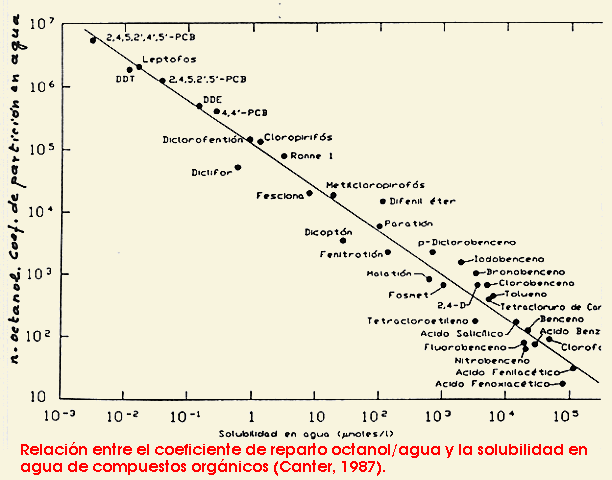 En el caso de plaguicidas se emplea el coeficiente de reparto octanol:agua (Koa), que mide la hidrofobicidad (o la lipoafinidad) de un compuesto (figura).