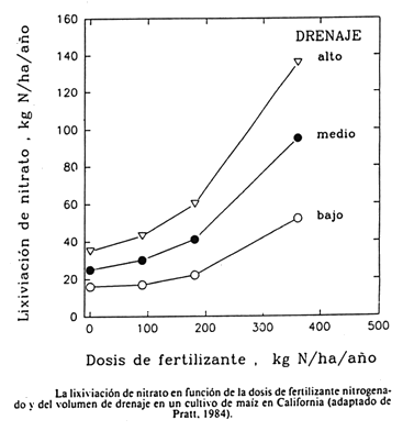 Por otra parte, para una misma dosis de fertilizante nitrogenado, por ejemplo 200 Kg/ha, la lixiviación es mayor cuando el suelo presenta un drenaje más alto. Así mismo, podemos evaluar el exceso de N que se puede producir en función de la cantidad de N fertilizante aplicado y del drenaje del suelo.