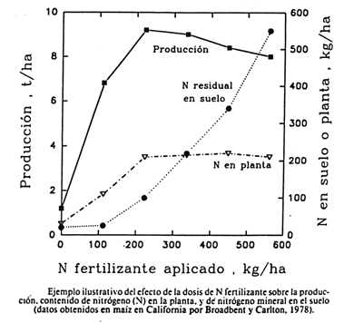 En las siguiente figura se muestra la reacción de los cultivos frente a la fertilización con nitrógeno, así como su distribución en la planta y en el suelo.