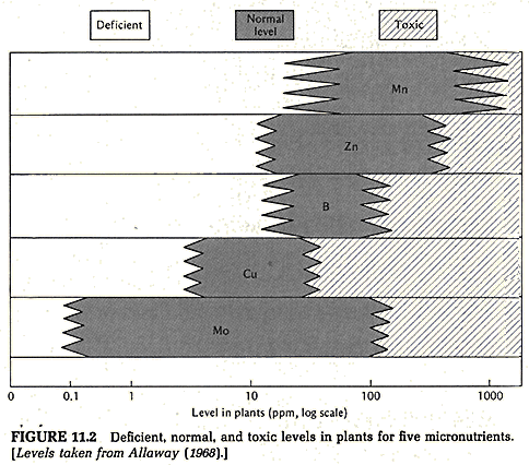 Una característica común a todos los oligoelementos es el hecho de que a partir de una determinada concentración, una vez superado el rango óptimo, toda cantidad adicional se vuelve tóxica para las plantas incluso llegando a un rango en el que la concentración es letal.