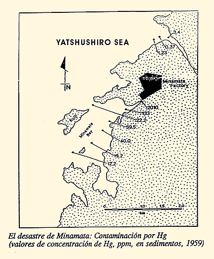 En la bahía de Minamata, en el sur del Japón, se produjo una enfermedad denominada "Enfermedad de Minamata", debida al consumo de pescado y mariscos contaminados con metil mercurio, debido al paso de Hg++ a metilmercurio por acción bacteriana. La producción de metil-Hg por bacterias y su liberación en el medio acuático es un mecanismo de defensa que protege los microbios del envenenamiento de Hg. La metilación bacteriana movilizó el Hg almacenado en los sedimentos de la bahía. Este mercurio procedía de una fábrica de plásticos que utilizaba Hg como catalizador y vertía los residuos en la Bahía.