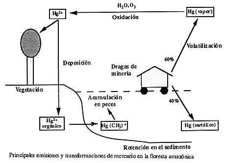 El mercurio es un elemento ampliamente utilizado para extraer oro de sedimentos y suelos en Brasil, Venezuela, Filipinas e Indonesia. El mercurio se añade a los sedimentos que contienen partículas de oro finamente divididas, tratandose grandes volúmenes de tierra. El oro forma un amalgama que puede ser separada fácilmente (por sedimentación) de la tierra tratada. La amalgama separada, es quemada para volatilizar el mercurio, como resultado, el mercurio entra en la atmósfera. El vapor de mercurio elemental liberado en la atmósfera, durante la tostación de la amalgama Au/Hg y vaporizado durante los distintos procesos de extracción de oro, es oxidado a Hg++ mediante ozono, energía solar y vapor de agua. Una vez formado, el mercurio iónico Hg++ es arrastrado de la atmósfera por las lluvias y depositado sobre ambientes terrestres y acuáticos donde es convertido en metil mercurio en el suelo. El metil mercurio puede ser fácilmente transportado del suelo al medio acuático. También se pierde mercurio durante todo el proceso y dicho mercurio termina en los ríos, en donde es fácilmente tomado por el pescado y es al menos 100 veces más tóxico que el Hg metálico.