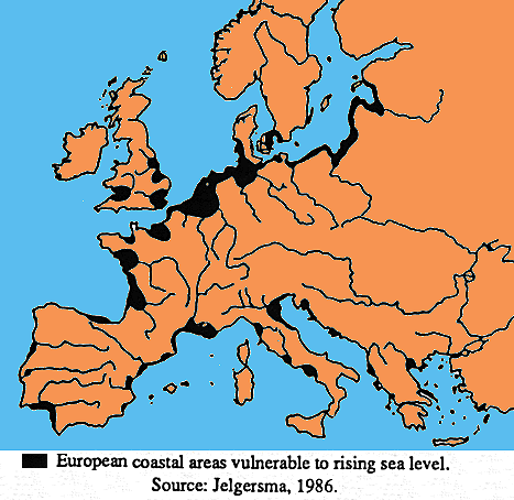 En el siguiente mapa se muestran las áreas de los suelos cercanos a las costas en Europa vulnerables a la ascensión del nivel del mar, si existiese un cambio climático.