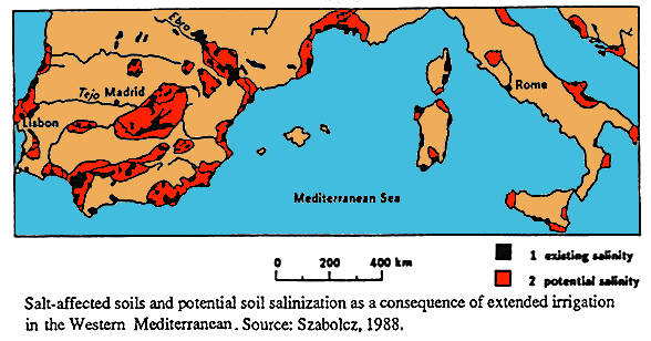 En la siguiente figura se reproducen la situación de los suelos particularmente vulnerables a la salinización en el Mediterráneo.