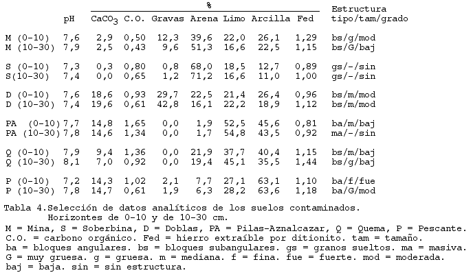 La mayoría de los suelos contaminados parecen presentar características favorables para neutralizar el impacto, destacando tres propiedades decisivas: pH básico, presencia de carbonatos y abundantes óxidos férricos (tabla 4).