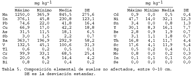 En la tabla 5 resumimos las concentraciones de metales pesados en los suelos no afectados por la riada.