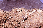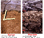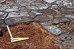 La entrada de lodos ha sido muy desigual dependiendo fundamentalmente de la estructura del suelo, la cual esta condicionada por la textura. En los arenosos, con bajo grado de desarrollo, la capa de lodos presenta un contacto neto con el suelo subyacente (Quema), con una entrada pequeña. Los muy arcillosos, muy estructurados, presentaba amplias grietas por las que los lodos entraron fácilmente alcanzando a los horizontes subsuperficiales (Pescante).