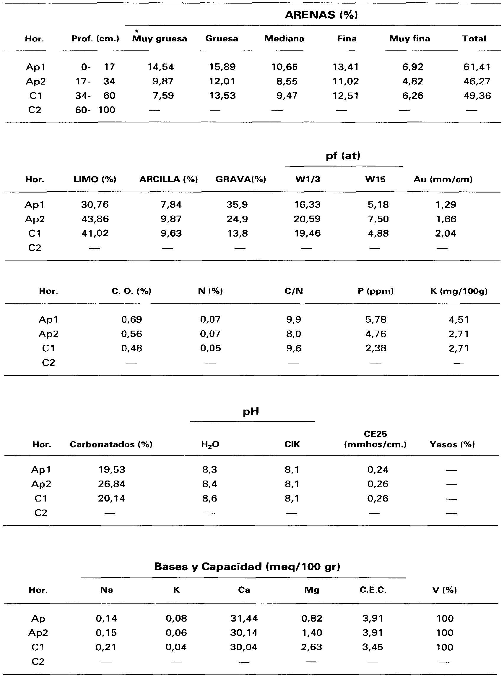 | Ap1 | 0-17 | Color pardo (7,5YR 5/4) en húmedo, rosado (7,5YR 7/3) en seco. Textura, |