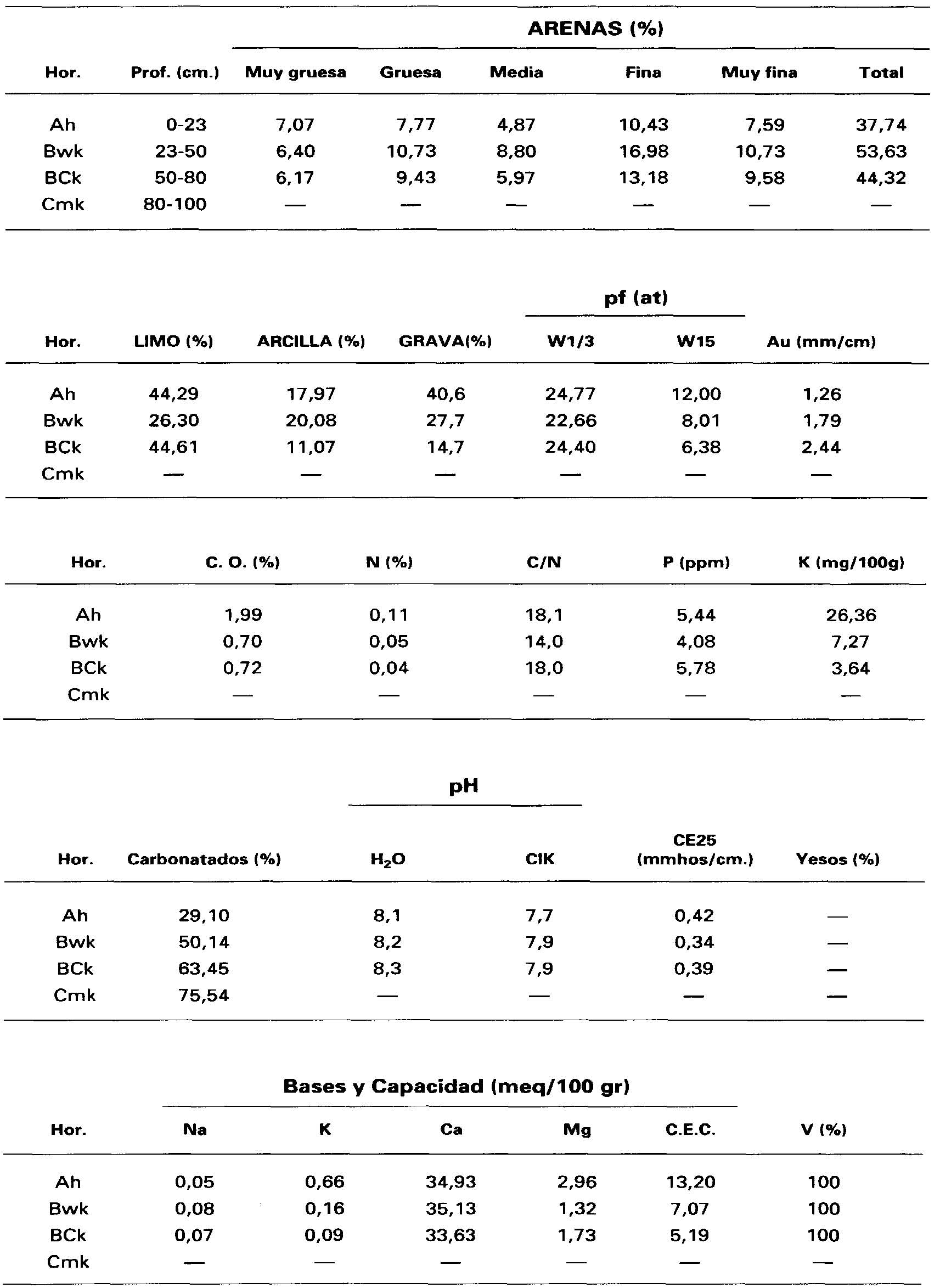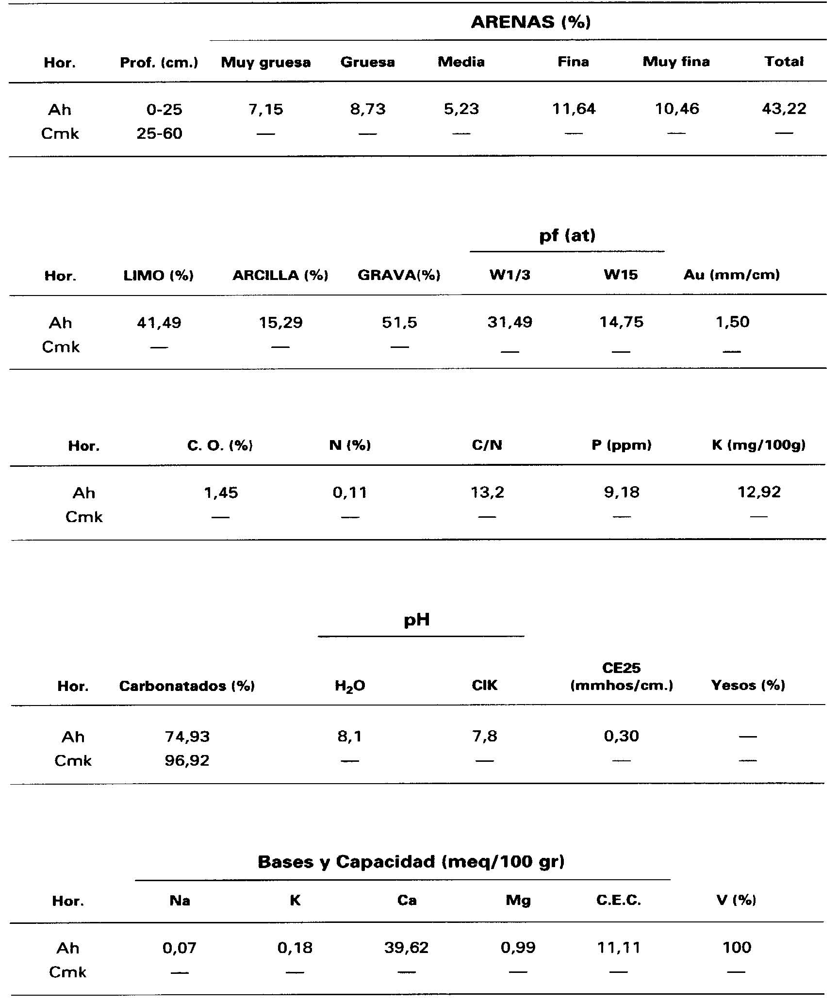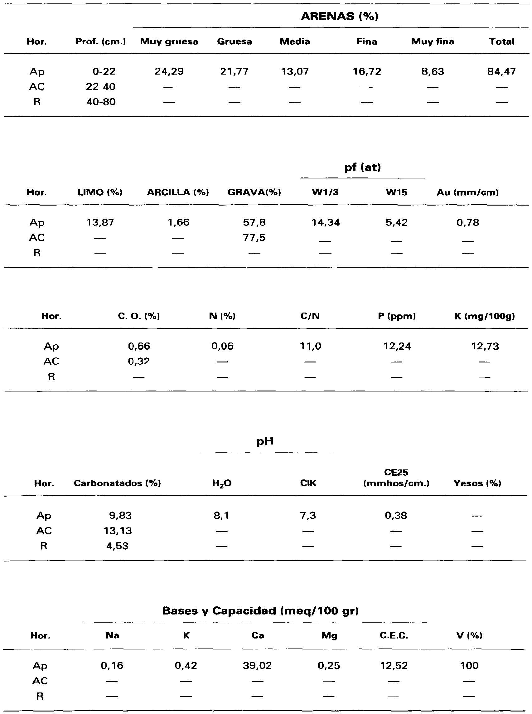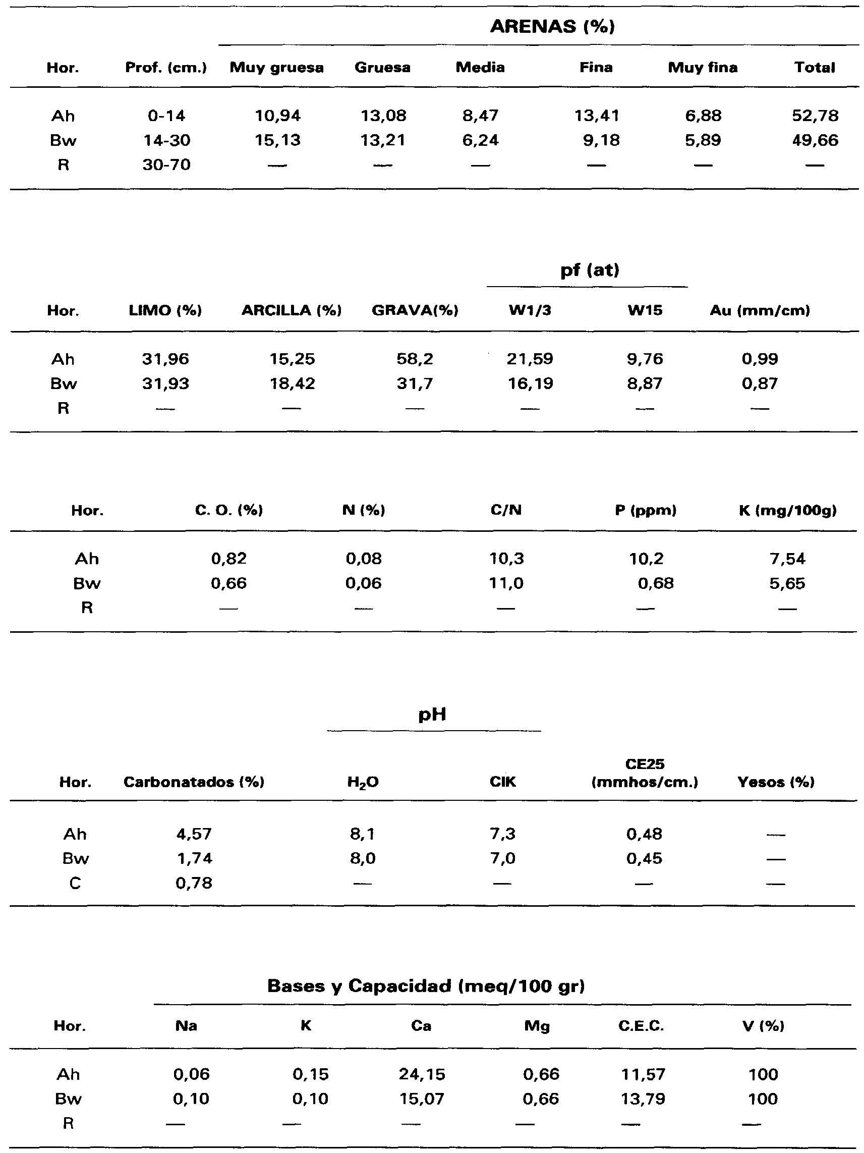 Se trata siempre de suelos con profundidad de 20-30 cm. con un desarrollo A-C, valores altos de pedregosidad y textura media a gruesa y con valores bajos en contenido en materia orgánica; las pendientes oscilan entre la clase 3 a la 5; la capacidad de cambio, como era predecible presenta valores bajos, oscilando entre 30-40 meq/100 gr. siendo el calcio el catión dominante.