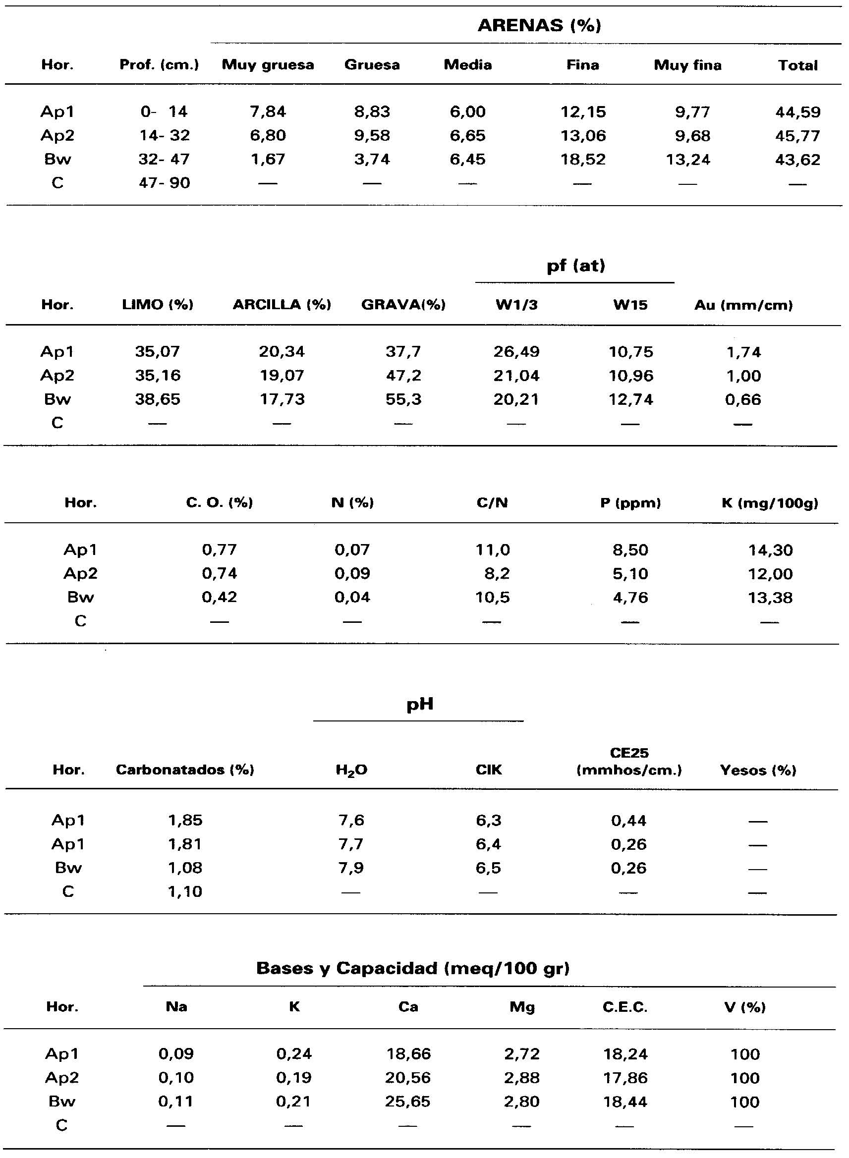 El contenido en materia orgánica es bajo y presentan contenidos variables de grava. Los valores de capacidad de cambio son medios-bajos, presentando valores de agua útil aceptables.