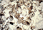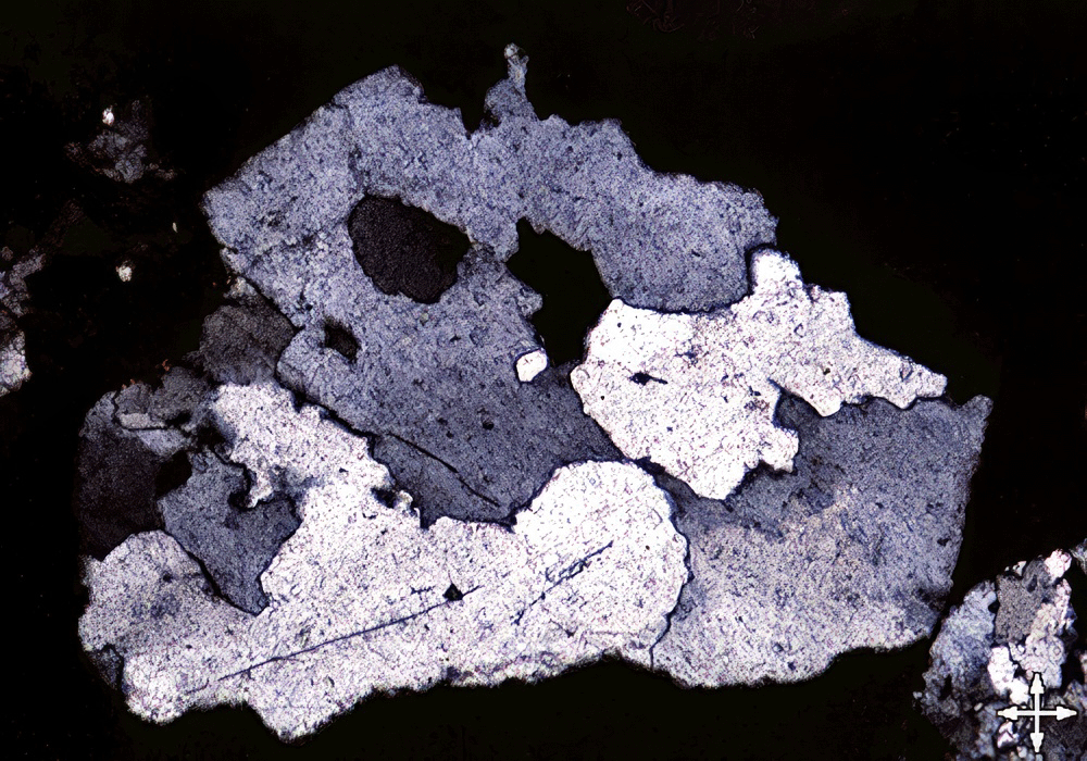 Polarizador y analizador: color de interferencia gris, limpio (sin alteraciones), sin maclas (en la inmensa mayoría de los casos). Frecuentemente presenta una extinción por zonas que se van desplazando al girar la platina del microscopio, que se llama extinción ondulante y constituye un rasgo muy representativo de este mineral (última foto). La presenta todos los granos que han sufrido tensiones, como es el caso, preferente, de los cristales de origen metamórfico.