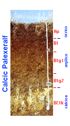 Con un argílico saturado en bases debe ser un Alfisol, por el régimen de humedad será un Xeralf. Por ser muy arcilloso (≥35%) y presentar un cambio textural abrupto (condicón 3b) será un Palexeral y por el horizonte cálcico, un Calcic Palexeralf .