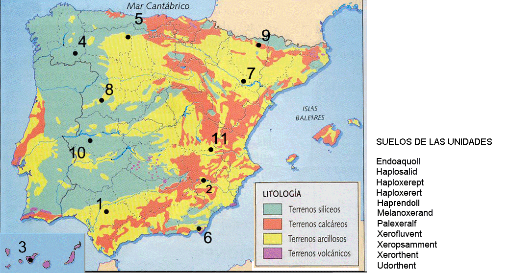 En relación a las rocas: arcillas, arenas y areniscas, calizas, cuarcitas, esquistos, evaporitas, filitas y pizarras, granitos, materiales fluviales materiales de los glacis, materiales orgánicos, materiales volcánicos, margocalizas, margas, margas con sales.