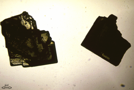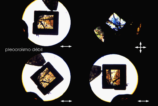 COLOR: PARDO, AMARILLO, AZUL, INCOLORO. PLEOCROISMO: DE INTENSIDAD DE COLOR. RELIEVE: POSITIVO EXTREMO. HABITO: PRISMATICO Y CUBICO. EXFOLIACION: DOS SISTEMAS A 90°. BIRREFRINGENCIA: EXTREMA. ANGULO DE EXTINCION: 0°. ELONGACION: NEGATIVA. MACLAS: NO. GRUPO OPTICO: UNIAXICO NEGATIVO