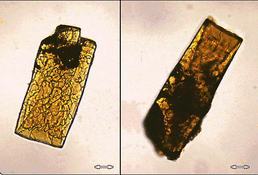 COLOR: AMARILLO, PARDO. PLEOCROISMO: MUY DEBIL EN INTENSIDAD DEL COLOR. RELIEVE: POSITIVO EXTREMO. HABITO: PRISMATICO, TABULAR. EXFOLIACION: NORMALMENTE POCO MARCADA. BIRREFRINGENCIA: EXTREMA. ANGULO DE EXTINCION: 0°. ELONGACION: NEGATIVA. MACLAS: RARAS. GRUPO OPTICO: BIAXICO POSITIVO, ANGULO 2V 0-30°.