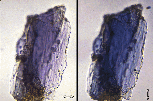 COLOR: AZUL LAVANDA. PLEOCROISMO: MARCADO. RELIEVE: POSITIVO MODERADO. HABITO: PRISMATICO. EXFOLIACION: PERFECTO (110). BIRREFRINGENCIA: MODERADA. ANGULO DE EXTINCION: 3° - 11°. ELONGACION: POSITIVA. MACLAS: NO. GRUPO OPTICO: BIAXICO NEGATIVO.
