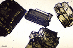 COLOR: VERDE, PARDO. PLEOCROISMO: FUERTE. RELIEVE: POSITIVO ALTO. HABITO: PRISMATICO. EXFOLIACION: DOS SISTEMAS PERPENDICULARES. BIRREFRINGENCIA: MUY FUERTE. ANGULO DE EXTINCION: 2°-5°. ELONGACION: NEGATIVA. MACLAS: SI. GRUPO OPTICO: BIAXICO NEGATIVO.