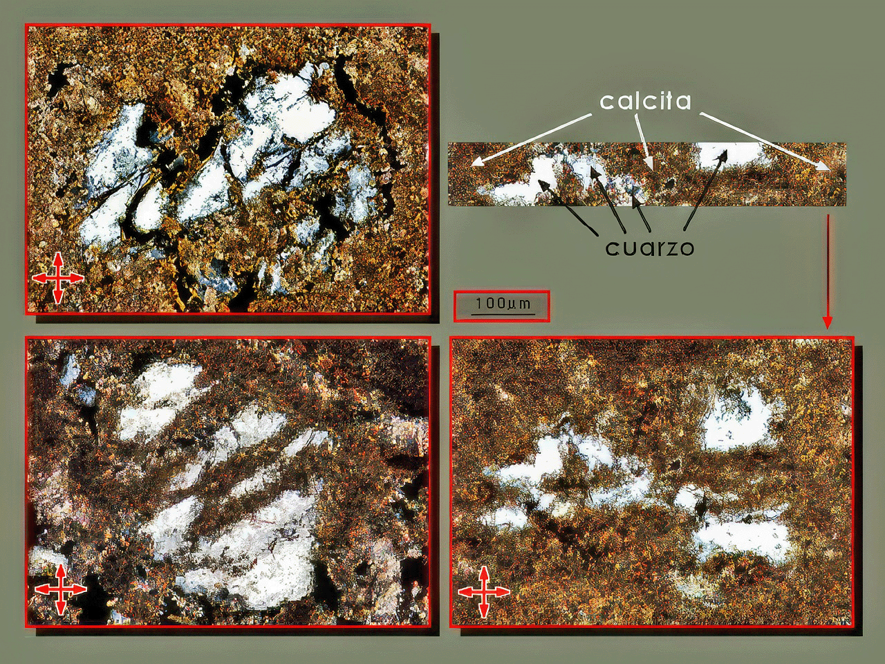 El reemplazamiento de silicatos se muestra también por la presencia de feldespatos y granos de cuarzo flotantes en una matriz de carbonatos y separados de ellos por un espacio poroso más o menos grande.