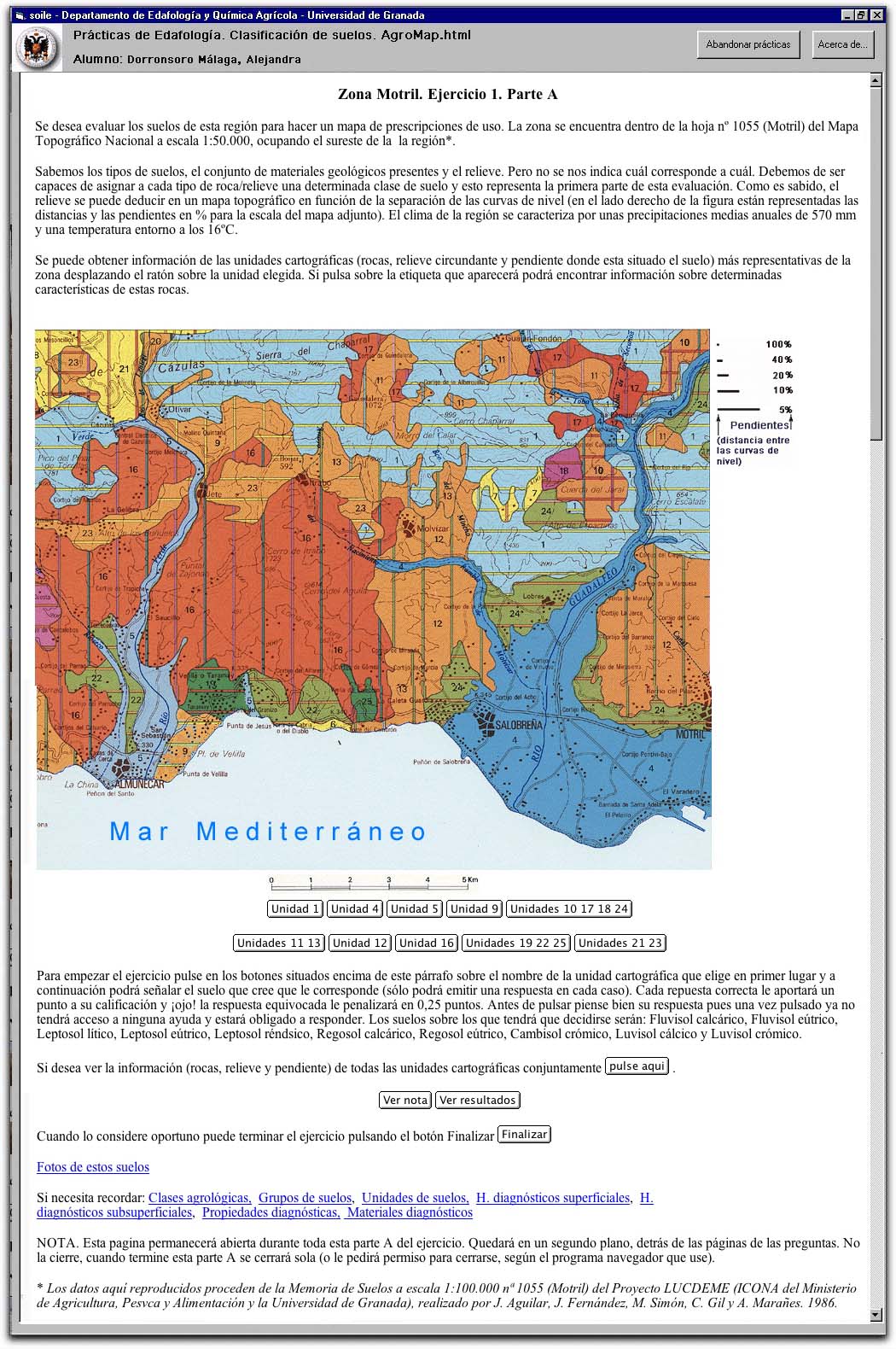 En la primera fase de AgroMap.html se muestran una serie de unidades cartográficas de suelos en las que se indica el material original y el relieve pero no el tipo concreto de suelo dominante. Este ha de ser deducido dentro de una lista de posibles suelos.