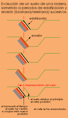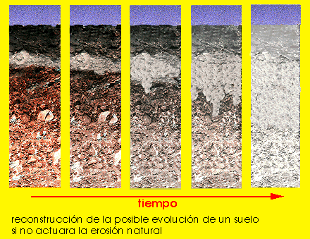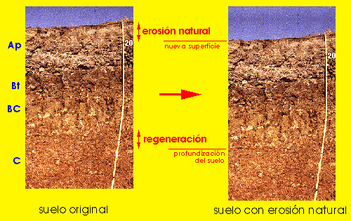 Afortunadamente este panorama aterrador no se presenta precisamente debido a la erosión geológica. Esta lenta erosión va decapitando lentamente las capas superiores de los suelos con lo que va disminuyendo el espesor del suelo y este se va progresivamente profundizando hacia capas más internas donde se encuentra el material original sin transformar (para mantener su profundidad de equilibrio con las condiciones ambientales) (figura). Así, de esta manera se van incorporando continuamente nuevos materiales al suelo (materiales frescos, no alterados, con abundantes minerales que al alterarse aportan nutrientes a los suelos). El tipo de suelo será siempre el mismo (mientras no se produzca un cambio en las condiciones ambientales) pero, ¡se irá desplazando con el tiempo!. Hacia el interior de la tierra en los relieves planos y caminando lateralmente en los relieves colinados (los valles se van ensanchando).