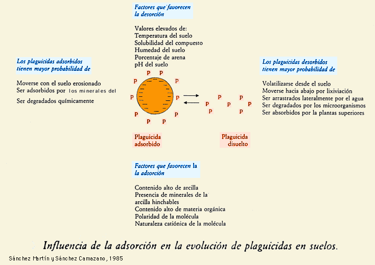 La adsorción es la interacción superficial entre un elemento o molécula (adsorbato) y una fase sólida (adsorbente). Y como resultado la molécula del plaguicida queda retenida en el suelo.