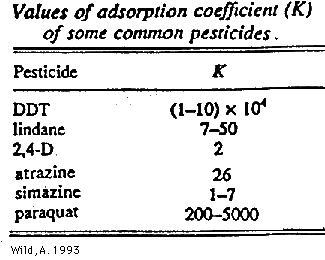 K=(Coc x foc + Cmin x fmin )/Cw; donde Coc/Cw= coeficiente de reparto del plaguicida entre el carbono orgánico y la solución del suelo, y Cmin/Cw= coeficiente de reparto del plaguicida entre la arcilla y la solución del suelo. Dado que la materia orgánica actúa como el principal adsorbente de los plaguicidas, podemos simplificar K=Koc x foc.