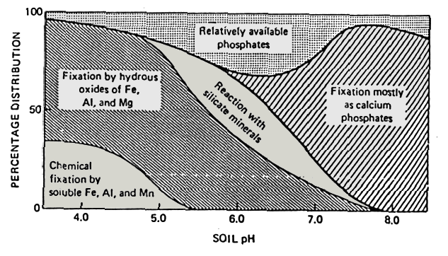Generalmente los fosfatos forman compuestos insolubles con iones Fe+3 y Al+3 en medio ácido y con Ca++ en medios alcalinos. Tan solo existe un rango de pH (alrededor de 6,5) en el que el fosfato se mantiene soluble, que es la situación en la que se puede presentar cierto riesgo de lixiviación.