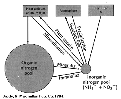 El nitrógeno añadido como abono, puede estar como urea, NH4+ y NO3-. Este nitrógeno sigue los mismos modelos de reacción que el nitrógeno liberado por los procesos bioquímicos a partir de residuos de plantas.