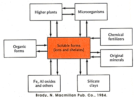 Las fases solubles de los oligoelementos se pueden encontrar en forma iónica o bien quelatada, siendo fácilmente absorbibles por las plantas. Los oligoelementos de la solución del suelo, en parte se pueden inmovilizar por complejación con sustancias húmicas insolubles o a través de la fijación sobre las superficies de los minerales de la arcilla o de los óxidos. Por otra parte los residuos de las plantas, por descomposición, liberan oligoelementos y moléculas orgánicas quelatantes, moléculas que pueden mantenerlos en solución, así como favorecer la solubilización de las formas insolubles. Por último una fracción es exportada del ciclo mediante las cosechas.