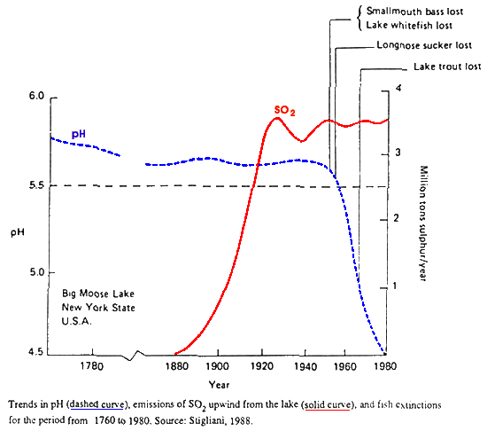 El lago de Big Moose se localiza en el estado de Nueva York, que recibe un elevado nivel de deposición ácida. Como vemos en la siguiente figura, existen datos del pH del agua del lago desde 1760 de las emisiones de S02 recibidas, así como la extinción de peces en el mismo.