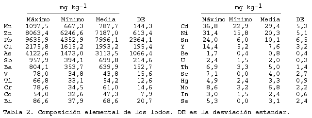Los valores medios de los principales metales pesados de los lodos se resumen en la tabla 2. Las concentraciones son mucho más elevadas que las correspondientes a las aguas. Los elementos predominantes son Pb, Zn, As, Cu, Mn, Sb y Ba. En cantidades no tan importantes se encuentran Tl, Cr, Co, Cd y Ni. Menores proporciones las presentan Mo, Hg y Sn.