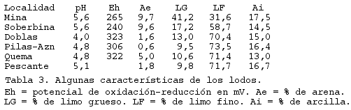 En cuanto a los valores de pH y Eh de los lodos vertidos (tabla 3), destaca su acidez y, en general, muestran un comportamiento similar al de las aguas: a bajos valores de pH le corresponden altos de Eh y viceversa. Los sulfuros se oxidan a sulfatos (baja el pH) y aumenta la solubilidad de las sales.