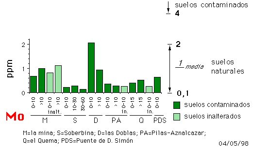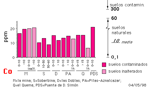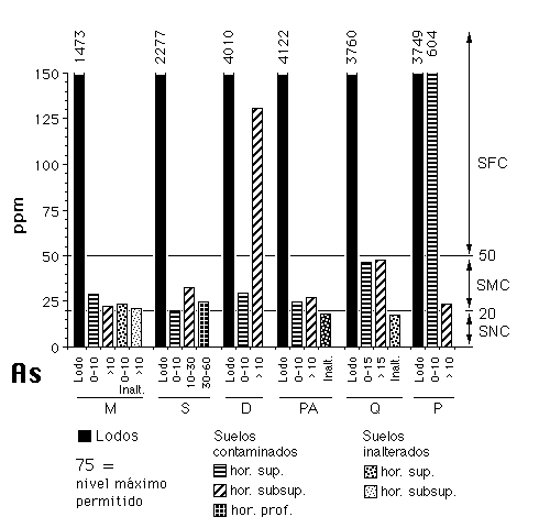 El As (valor medio = 127 mg kg-1) supera ampliamente el nivel de 20 mg kg-1 que es el de intervención en suelos agrícolas de Alemania (Kloke, 1980) y en Canadá (Sheppard et al., 1992) y también supera el de intervención en Bélgica (45 mg kg-1; Stringer, 1990), en Holanda (50 mg kg-1; NMHPPE, 1991) y el de toxicidad establecido por Kabata Pendias y Pendias (1992). De las trece muestras de suelos contaminados analizadas sólo en dos ocasiones (D y P) se alcanzan los niveles de intensa contaminación (figura 4). No obstante, todos los suelos superan o se aproximan al nivel de referencia, incluso cuando se trata de suelos no afectados por el actual vertido, lo que parece indicar la presencia de una amplia contaminación de la zona como resultado de la continua actividad minera a que ha estado sometida la región, hecho que ya ha sido considerado por Arambarri et al (1984).