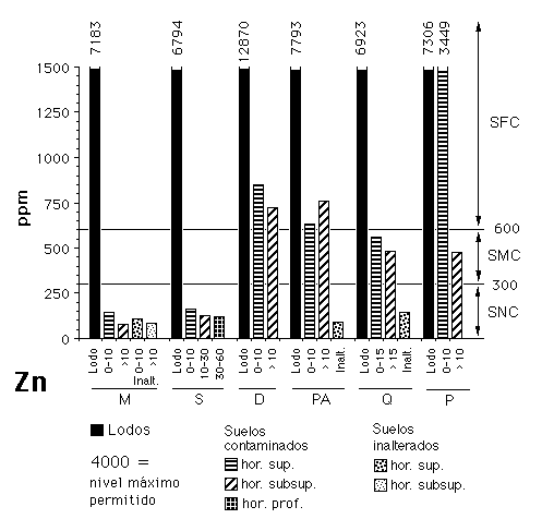 El Zn (valor medio = 747,9 mg kg-1) rebasa el nivel de 600 mg kg-1, que es el de intervención para suelos agrícolas en Bélgica (Prost, 1997) y Canadá (Sheppard et al., 1992). La mitad de los suelos entran dentro de los límites establecidos para los suelos fuertemente contaminados (D, PA y P) y sólo dos de ellos (M y S) se pueden considerar libres de contaminación (figura 5).