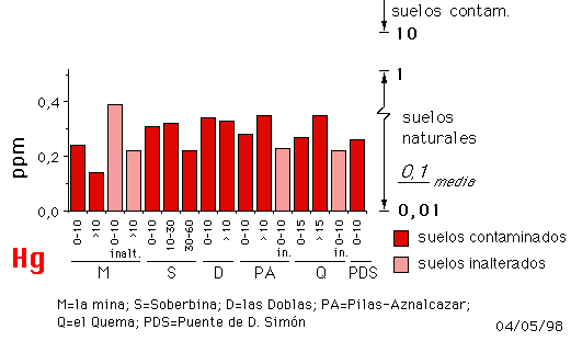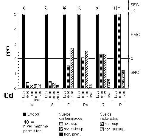 Los contenidos medios en Cd (2,2 mg kg-1) superan ligeramente el nivel de intervención para suelos agrícolas en Bélgica de 2 mg kg-1; Adriano et al. 1997 (seis de los trece horizontes analizados se encuentran moderadamente contaminados; ver figura 6) pero no rebasan en ningún caso el nivel de intervención fijado en Holanda (12 mg kg-1; NMHPPE, 1991).