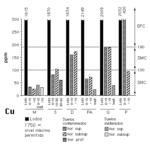El valor medio para Cu (132,8 mg kg-1) es algo mayor que el valor de referencia de Francia (100 mg kg-1 según AFNOR, 1985) y de Alemania (100 mg kg-1 según Barth y Hermite, 1987) pero no se supera el valor de intervención fijado en Holanda (190 mg kg-1; NMHPPE, 1991) que es el mismo del ecotoxicológico de Van der Berg (1993. En sólo una ocasión se puede hablar de suelo fuertemente contaminado (figura 7), ampliándose a cinco el número de horizontes moderadamente contaminados.