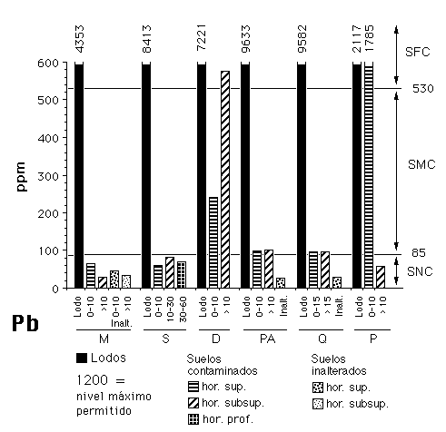En el caso del Pb, su valor medio (370,4 mg kg-1) rebasa el nivel de intervención para los suelos agrícolas belgas (300 mg kg-1, según Adriano et al. 1997), pero no supera el umbral para la intervención en Canadá (375 mg kg-1; Sheppard et al. 1992) ni el de Holanda (530 mg kg-1; NMHPPE, 1991). Sólo dos suelos (D y P) pueden considerarse como gravemente afectados (figura 8).