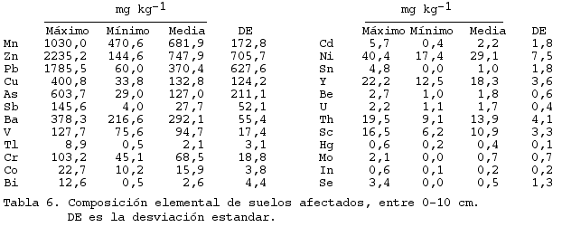 En la tabla 6 resumimos las concentraciones de metales pesados en los suelos contaminados.