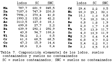 Al comparar los contenidos de los suelos contaminados con los de los suelos no afectados y con los de los lodos (tabla 7), podemos diferenciar tres tipos de comportamientos.