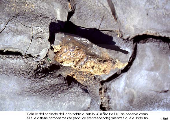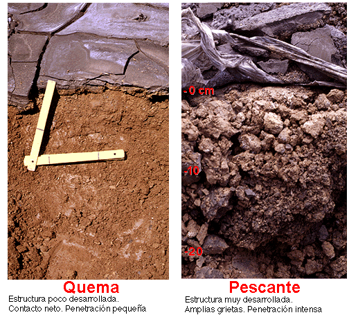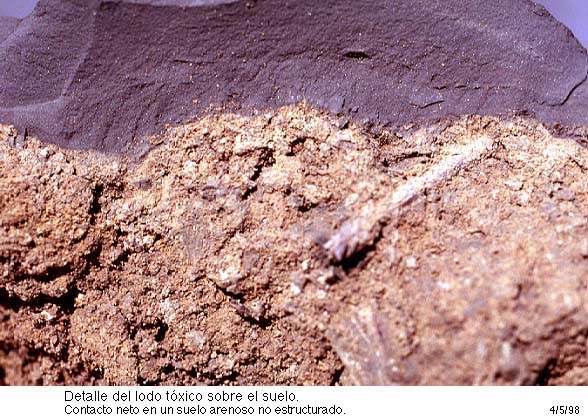 La entrada de lodos ha sido muy desigual dependiendo fundamentalmente de la estructura del suelo, la cual esta condicionada por la textura. En los arenosos, con bajo grado de desarrollo, la capa de lodos presenta un contacto neto con el suelo subyacente (Quema), con una entrada pequeña. Los muy arcillosos, muy estructurados, presentaba amplias grietas por las que los lodos entraron fácilmente alcanzando a los horizontes subsuperficiales (Pescante).