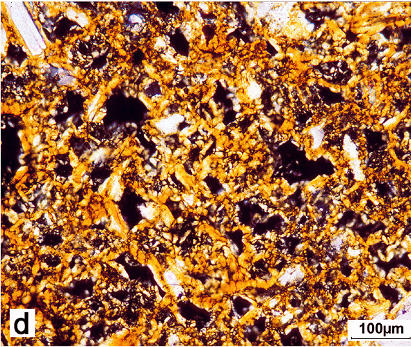 Para este suelo todo empezó con esta imagen c, microfotografía con sólo polarizador; d, microfotografía con polarizador y analizador cruzados Al observar una lámina delgada en el microscopio petrográfico de uno de los horizontes subsuperficiales de este suelo nos encontramos con esta imagen.