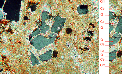 Ce = carbonatos espáticos; Cm = carbonatos micríticos; Cmf= carbonatos micríticos con Fe. Los carbonatos son de calcita. Q = cuarzo; Fe = óxidos de Fe; P = poros Las fotos está tomadas en el microscopio petrográfico con polarizador y analizador incorporados (nicoles cruzados). El lado más largo de las microfotografías mide en la realidad 2,5 mm. |