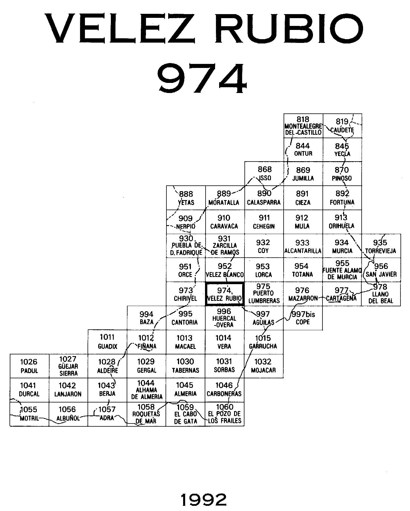 La primera fase se realizó sobre una base exclusivamente topográfica, como son los mapas editados por el Servicio Geográfico del Ejercito. Empleamos la Hoja a escala 1:50.000 correspondiente al área de estudio, y la Hoja de HUERCAL-OVERA (12-20), escala 1:100.000, las que nos sirvieron para llevar a cabo un estudio puramente geográfico de la zona y poder establecer una serie de itinerarios que nos permitieran recorrer la totalidad de ésta.
