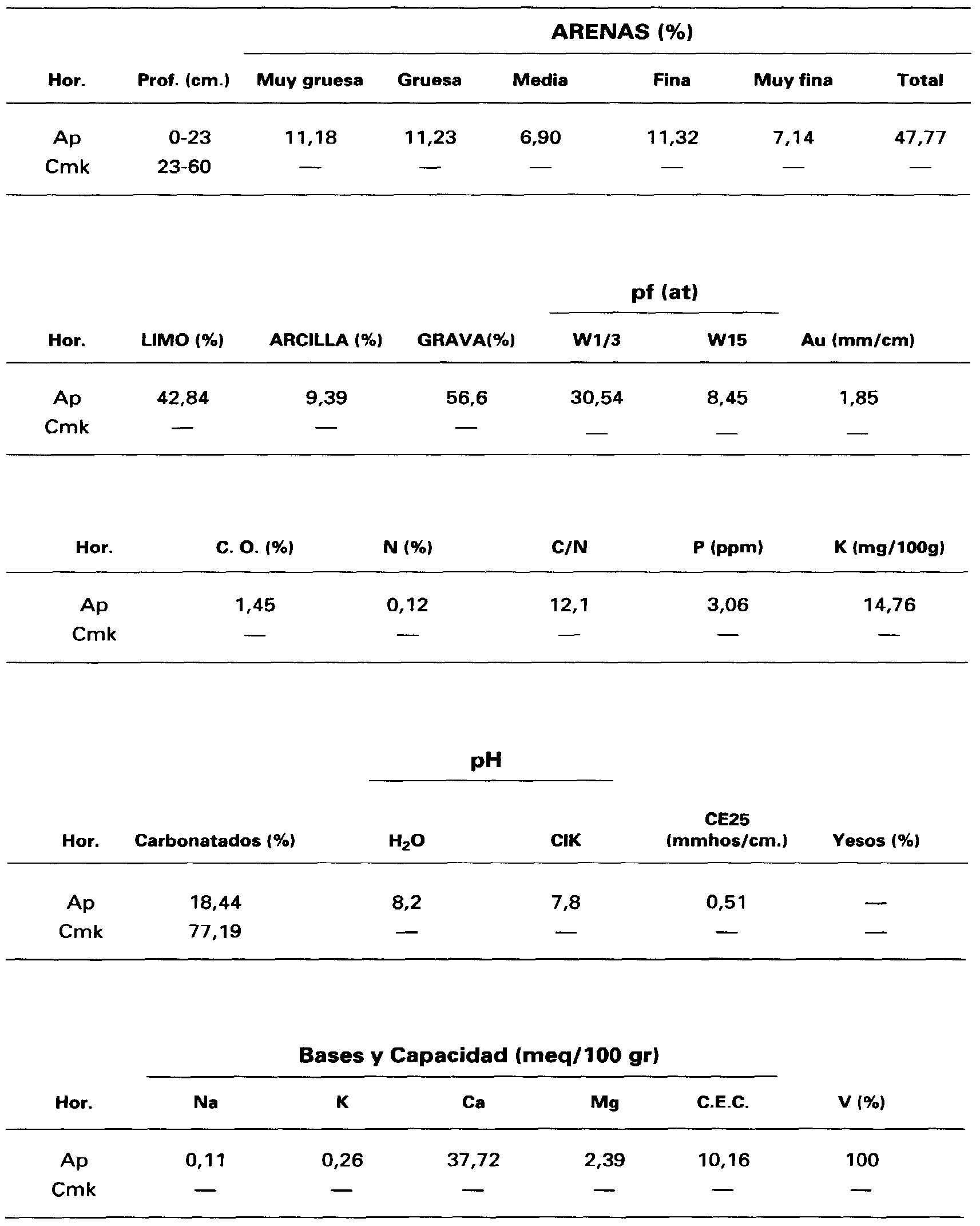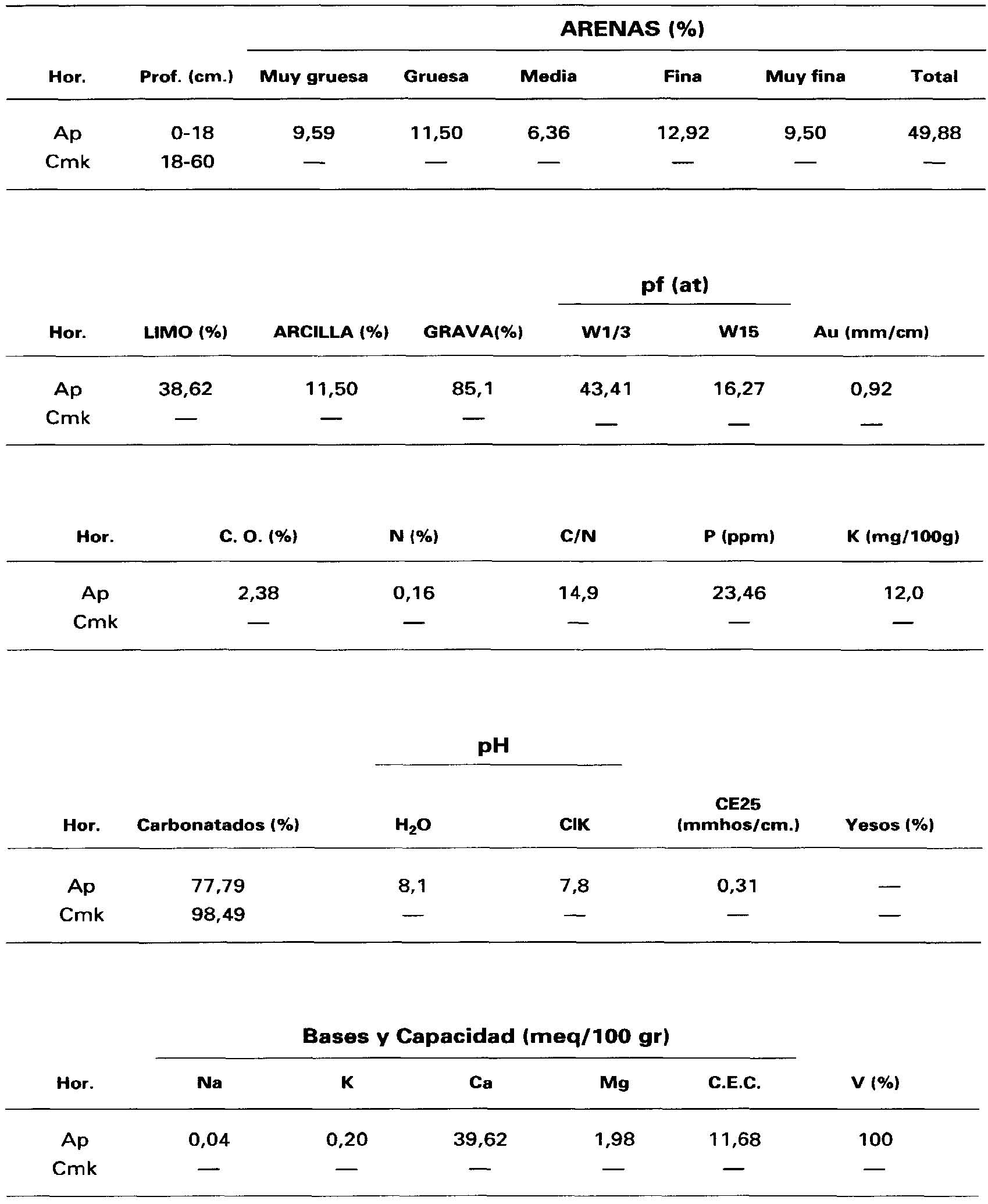 El contenido en materia orgánica es bajo y presentan contenidos variables de grava. Los valores de capacidad de cambio son medios-bajos, presentando valores de agua útil aceptables.