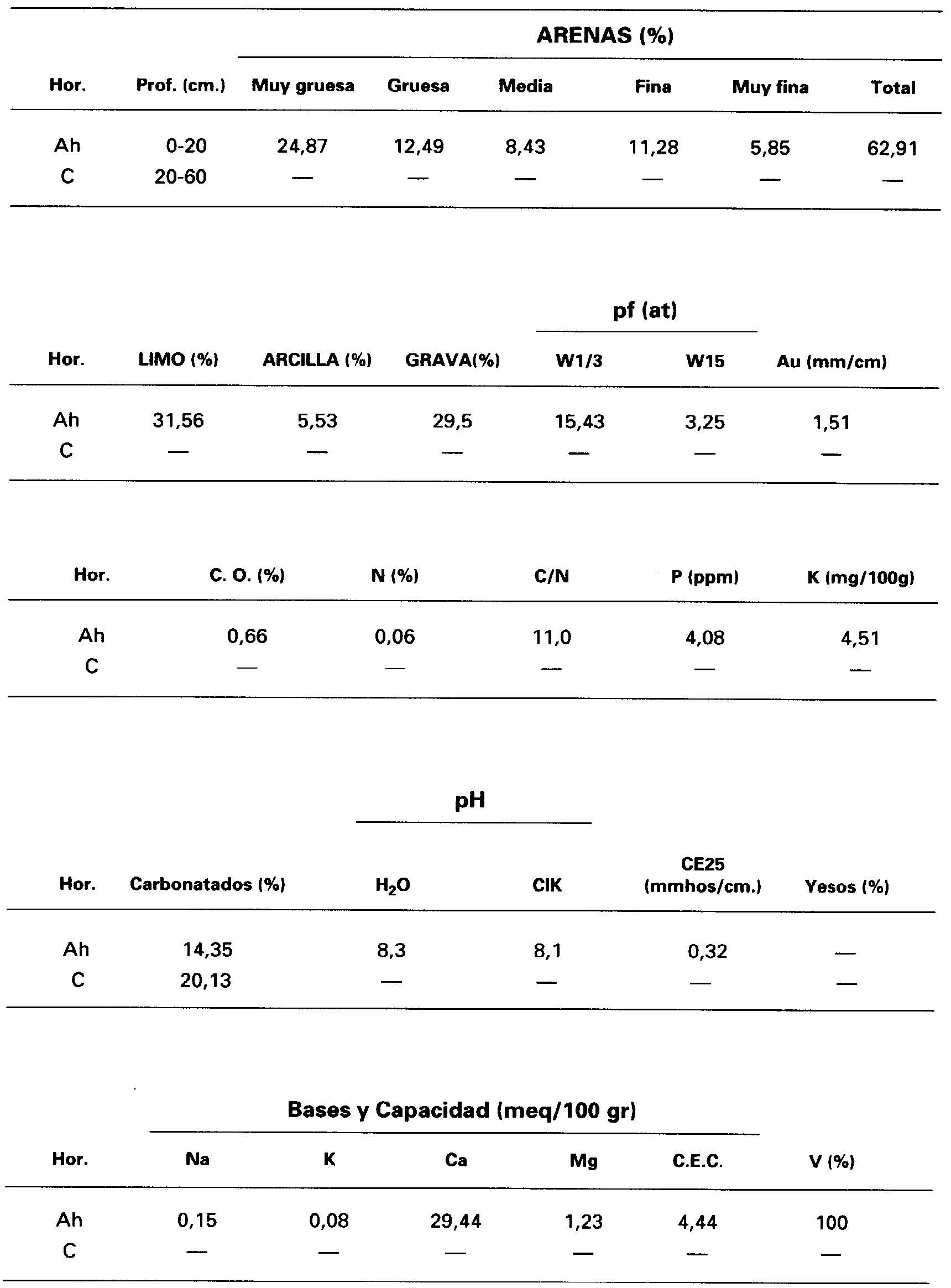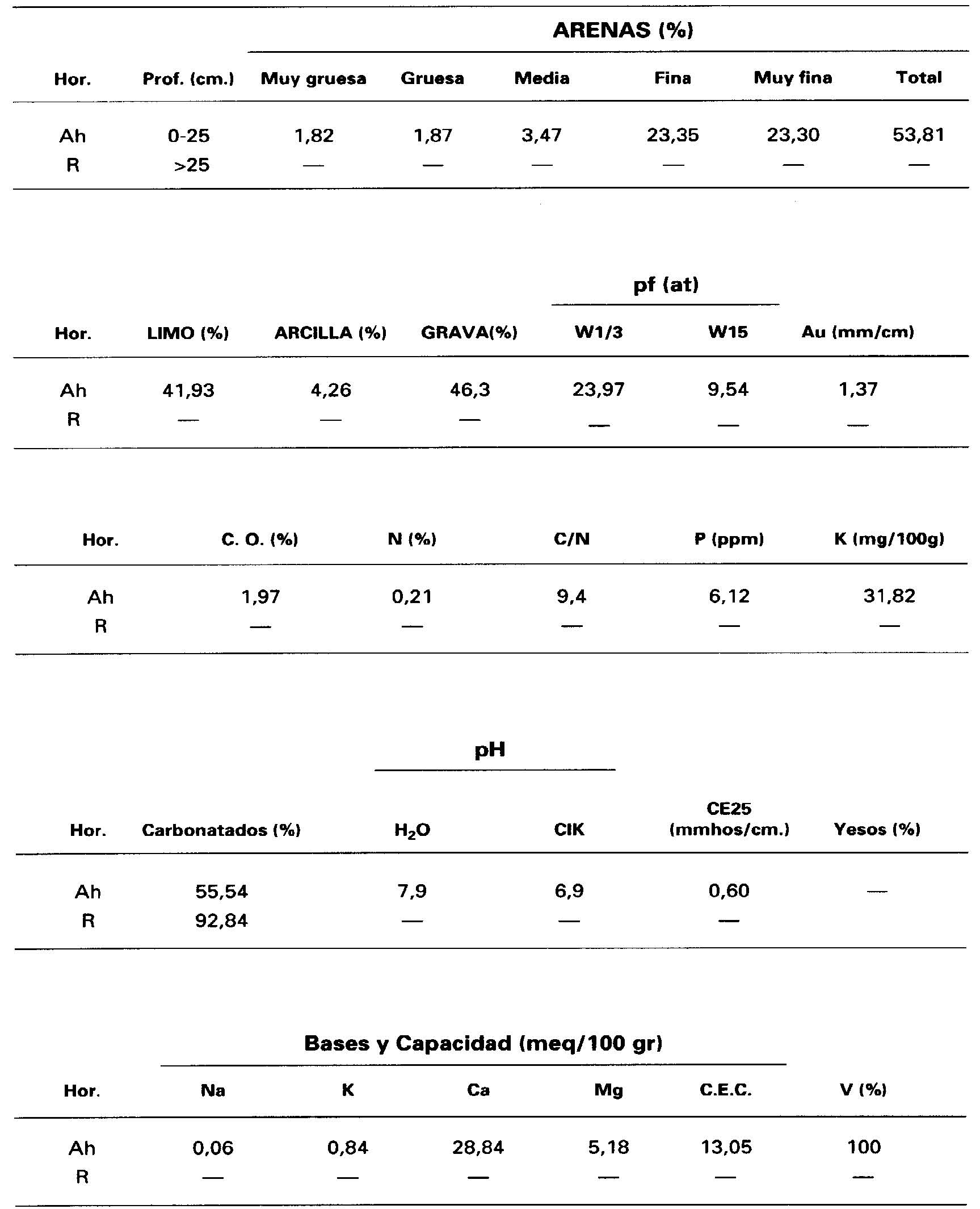Se trata siempre de suelos con profundidad de 20-30 cm. con un desarrollo A-C, valores altos de pedregosidad y textura media a gruesa y con valores bajos en contenido en materia orgánica; las pendientes oscilan entre la clase 3 a la 5; la capacidad de cambio, como era predecible presenta valores bajos, oscilando entre 30-40 meq/100 gr. siendo el calcio el catión dominante.