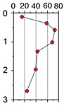 Arrastre las gráficas de la distribución de los contenidos en arcilla en función de la profundidad enmarcados en los cuadritos situados arriba (en abscisas el % en arcillas y en ordenadas la profundidad en metros) a los sitios que correspondan a los suelos situados en las cinco posiciones marcadas en la figura.
