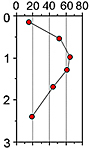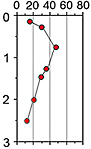 Arrastre las gráficas de la distribución de los contenidos en arcilla en función de la profundidad enmarcados en los cuadritos situados arriba (en abscisas el % en arcillas y en ordenadas la profundidad en metros) a los sitios que correspondan a los suelos situados en las cuatro posiciones marcadas en la figura.