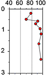 Arrastre las gráficas de la distribución de los valores de los contenidos en feldespatos en función de la profundidad enmarcados en los cuadritos situados arriba (en abscisas los contenidos en feldespatos en % y en ordenadas la profundidad en metros) a los sitios que correspondan a los suelos situados en las cuatro posiciones marcadas en la figura.